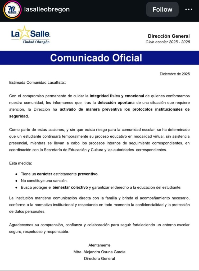 Activan protocolos de seguridad en La Salle Ciudad Obregón tras amenaza difundida en redes