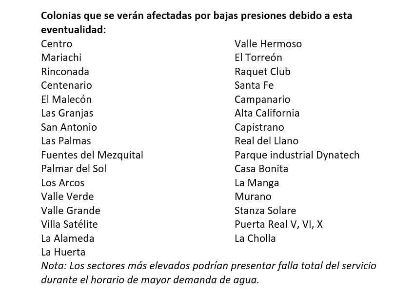 Sin embargo, algunas colonias se verán afectadas por bajas presiones debido a esta eventualidad. Entre las colonias que podrían experimentar bajas presiones se encuentran: Centro, Mariachi, Rinconada, Centenario, El Malecón, Las Granjas, San Antonio, Las Palmas, Fuentes del Mezquital, Palmar del Sol, Los Arcos, Valle Verde, Valle Grande, Villa Satélite, La Alameda, La Huerta, Valle Hermoso, El Torreón, Raquet Club, Santa Fe, Campanario, Alta California, Capistrano, Real del Llano, Parque Industrial Dynatech, Casa Bonita, La Manga, Murano, Stanza Solare, Puerta Real (etapas V, VI y X) y La Cholla.