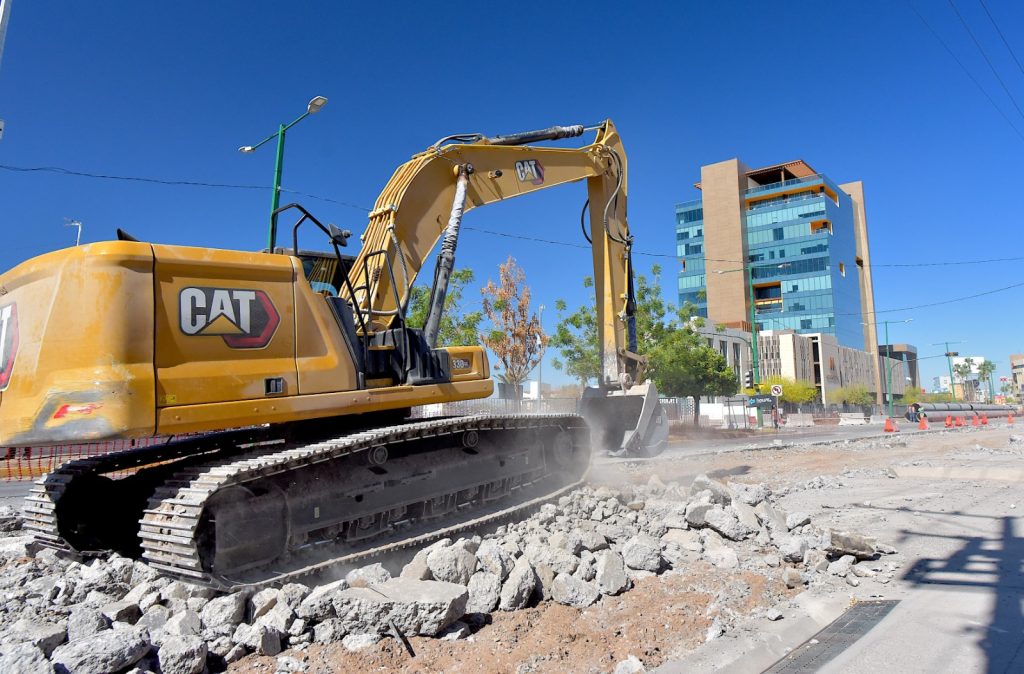 Hermosillo, Sonora; 18 de abril, 2025. La Dirección de Desarrollo de Infraestructura avanza con la demolición del cuerpo norte del bulevar Colosio, como parte de la construcción del paso a desnivel en Solidaridad y Colosio, donde se instala nueva tubería de drenaje de 36 pulgadas.