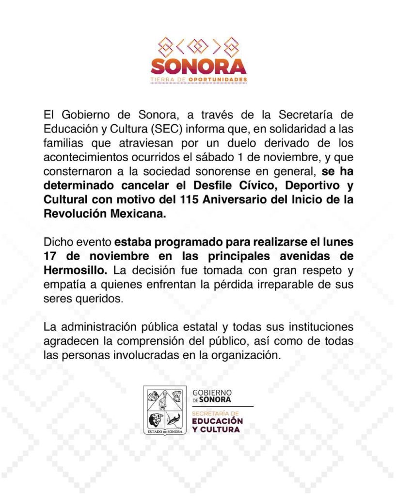 Hermosillo, Sonora; 8 de noviembre de 2025. El Gobierno de Sonora, a través de la Secretaría de Educación y Cultura (SEC), informó la cancelación del Desfile Cívico, Deportivo y Cultural con motivo del 115 Aniversario del Inicio de la Revolución Mexicana, como muestra de solidaridad con las familias que enfrentan el duelo derivado de los hechos ocurridos el pasado 1 de noviembre en Hermosillo.