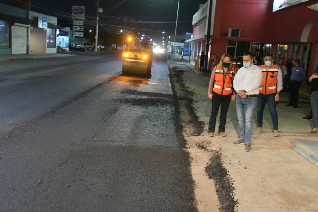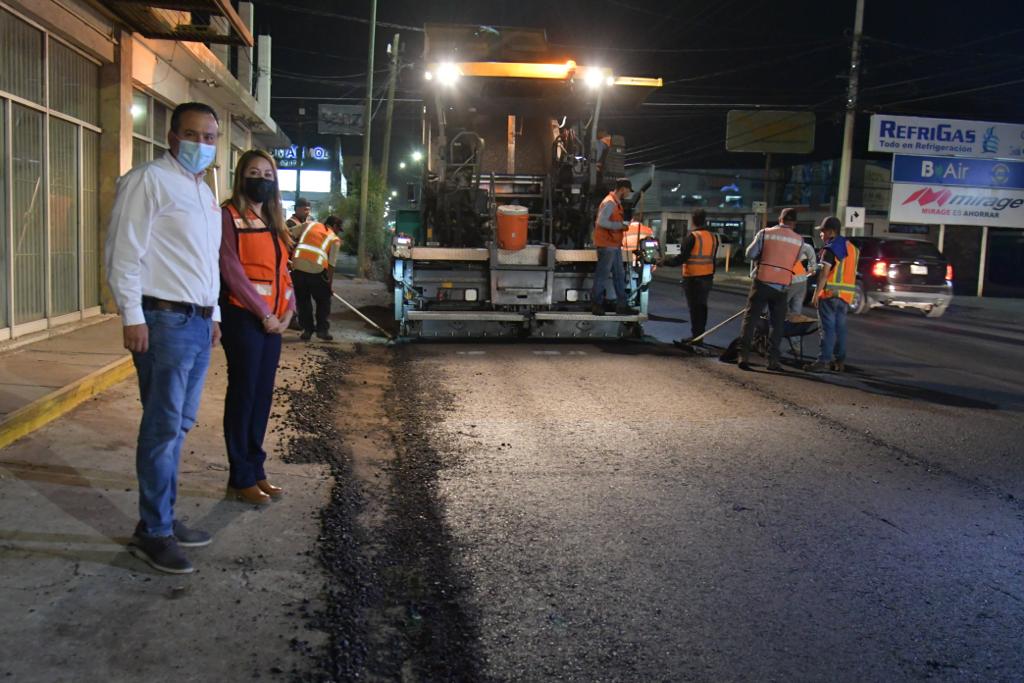 A partir de las 20:00 horas, Toño Astiazarán y Astarté Corro Ruiz, coordinadora de CIDUE, recorrieron la vialidad donde supervisaron los trabajos de recarpeteo de 16 mil 393 metros cuadrados, que se realizan en horario nocturno para evitar las molestias de quienes diariamente transitan.