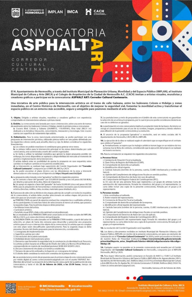 El Ayuntamiento de Hermosillo, a través del IMCA y el IMPLAN, lanzó oficialmente la convocatoria para que los artistas locales dejen su huella (literalmente) en el asfalto del Centro Histórico, convirtiendo cruces peatonales en obras de arte urbano.