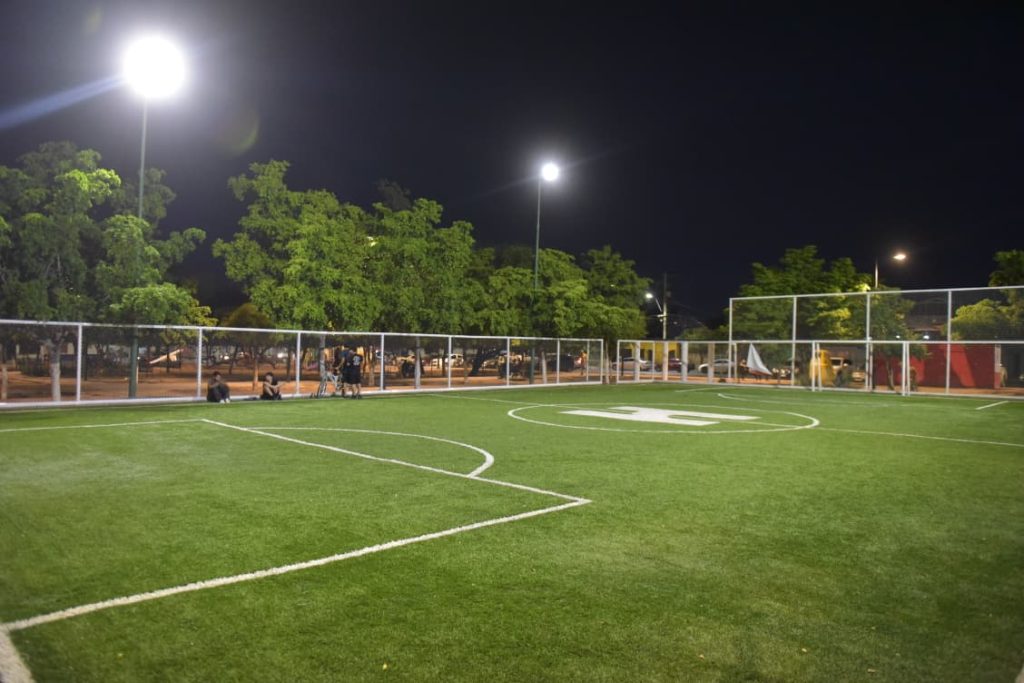 El espacio fue renovado con una inversión de 1.9 millones de pesos, que permitió mejorar la iluminación, renovar canchas, colocar pasto sintético, ejercitadores y juegos infantiles nuevos, transformando el lugar en un punto de encuentro para las familias y deportistas del sector.