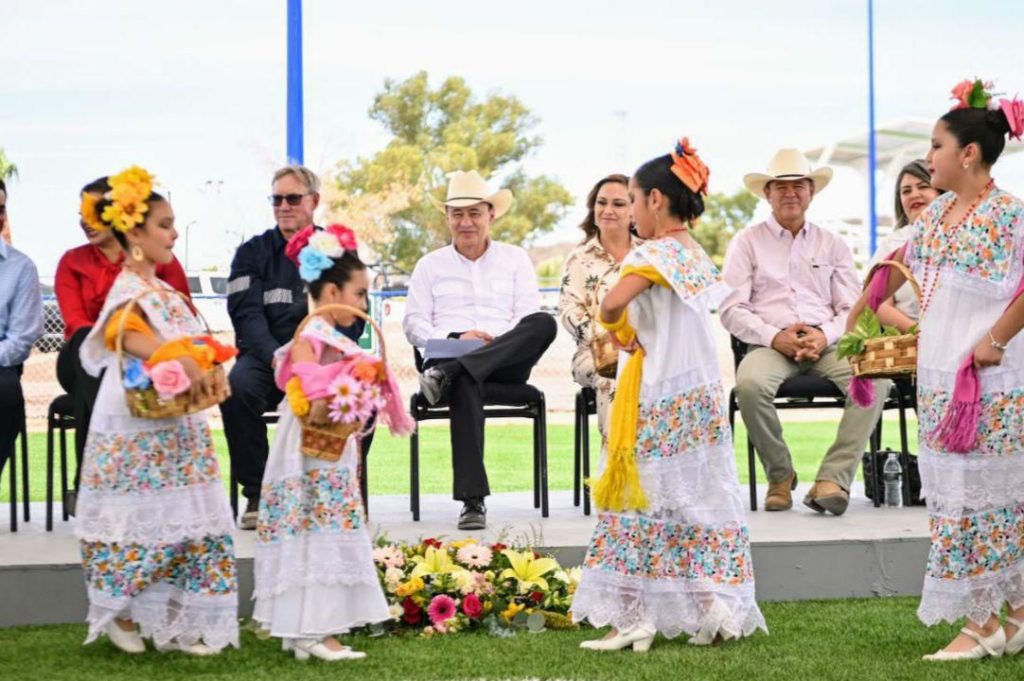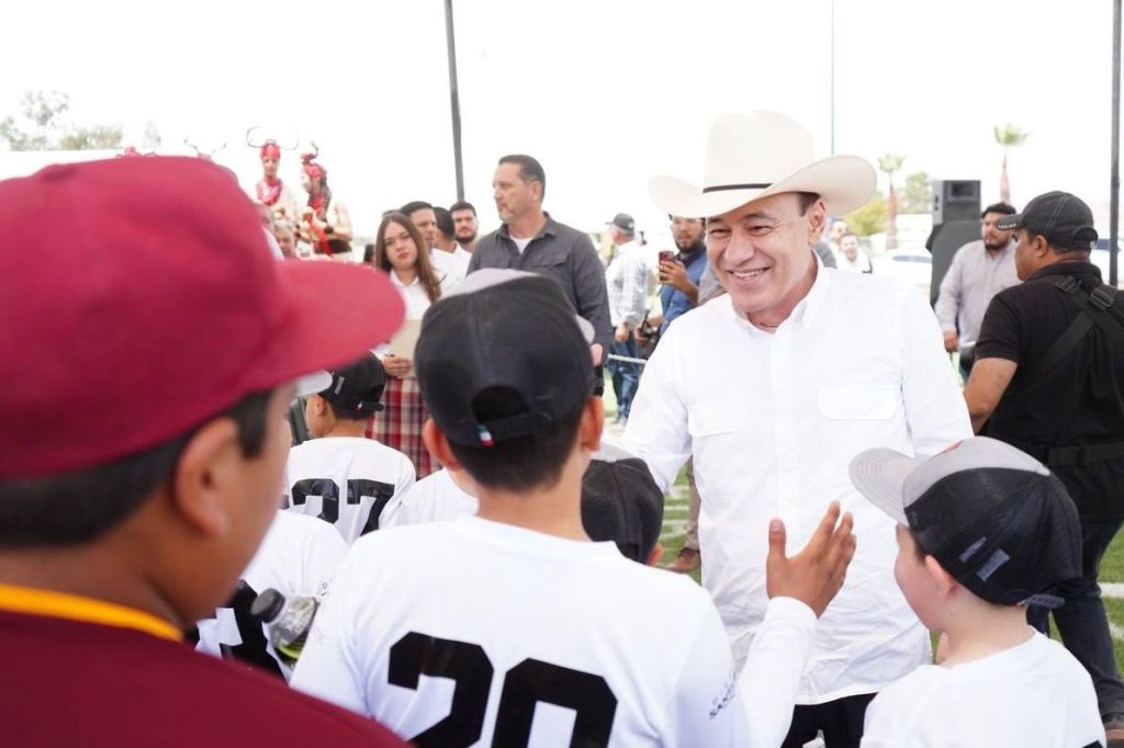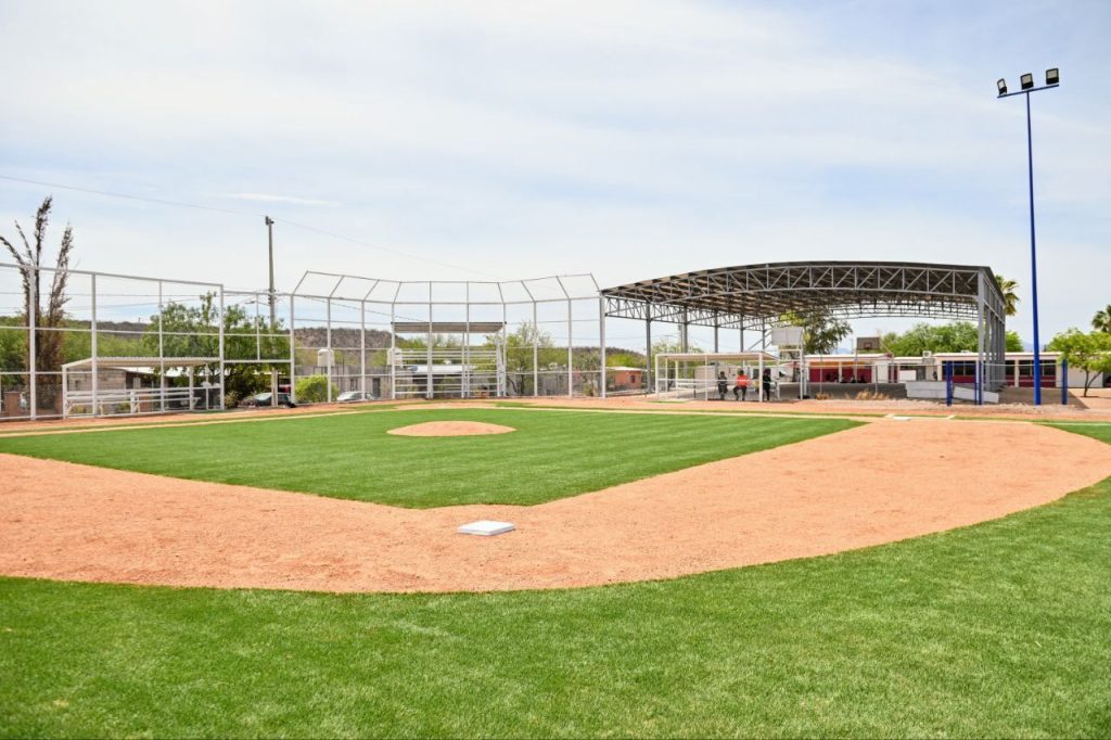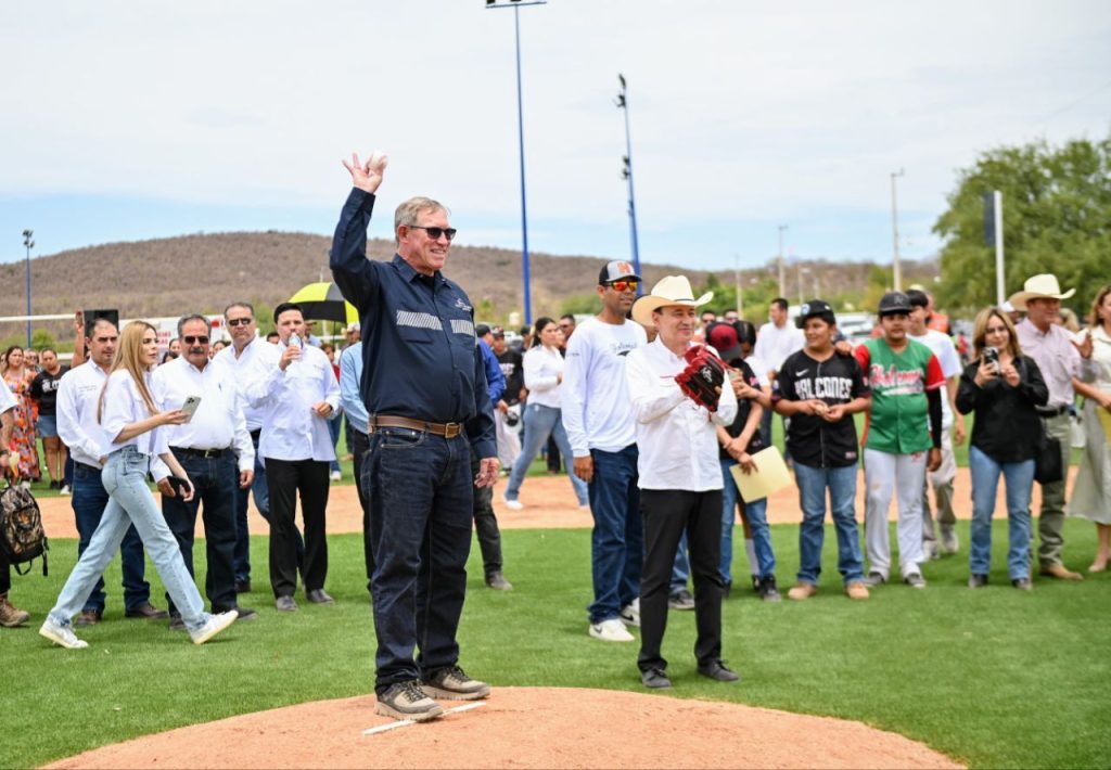 Acompañado por Edna Patricia Serrano Peña, presidenta municipal de Banámichi; Steve Holmes, director de Operaciones de la empresa minera First Majestic Silver Corp y Javier Villareal Gámez, secretario General del Sindicato Nacional de Trabajadores de la Industria Minera Metalúrgica CTM, el mandatario estatal develó la placa conmemorativa y participó en el lanzamiento de la primera bola en la nueva cancha de béisbol, marcando el arranque simbólico de las actividades deportivas en este espacio renovado.