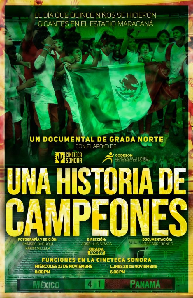 “Una Historia de Campeones” es un documental original del sitio especializado en deportes Grada Norte, que dirige José Luis Sibaja; con Karim Villela y Ramsés Baduqui, ambos como editores y fotógrafos; y con José Arredondo, en la documentación de la cinta; con música original de la banda Estación Desierto, originaria de Guaymas.