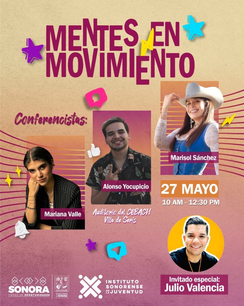 Hermosillo, Sonora; 22 de mayo de 2025.- Para conmemorar el Día del Estudiante, el Gobierno de Sonora, a través del Instituto Sonorense de la Juventud (ISJ), invita a las y los jóvenes a participar en “Mentes en Movimiento”, un evento lleno de inspiración, aprendizaje y motivación que se realizará el próximo 27 de mayo a las 10:00 horas en el Auditorio del Cobach Villa de Seris.