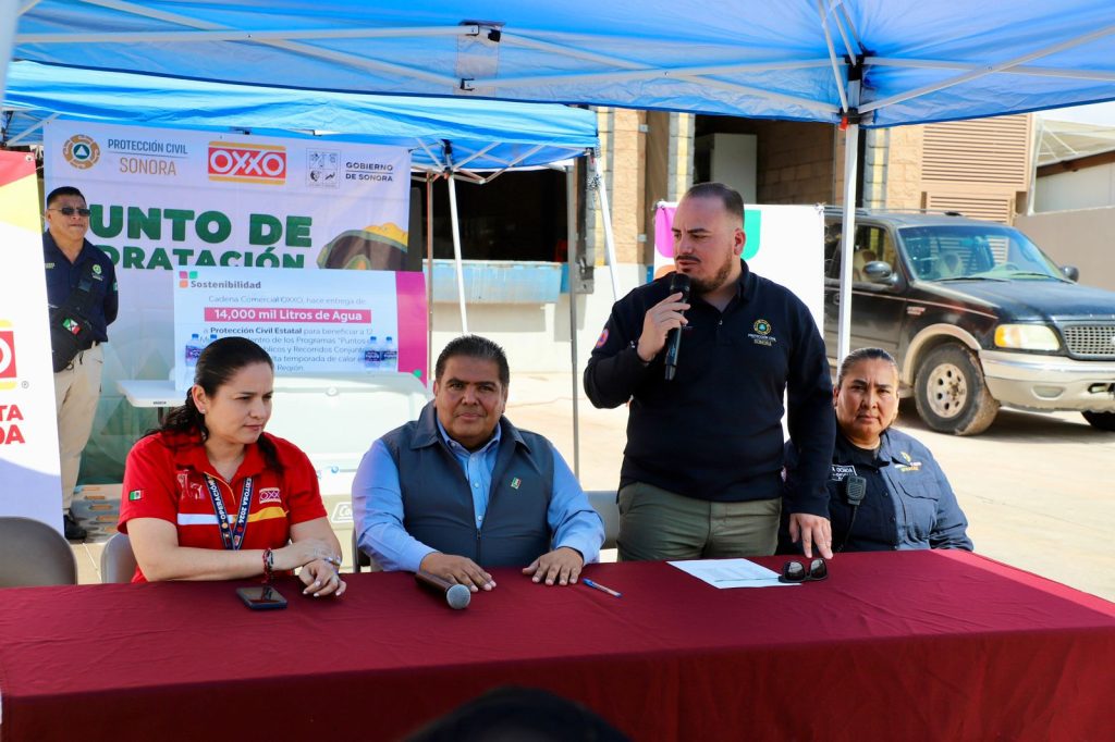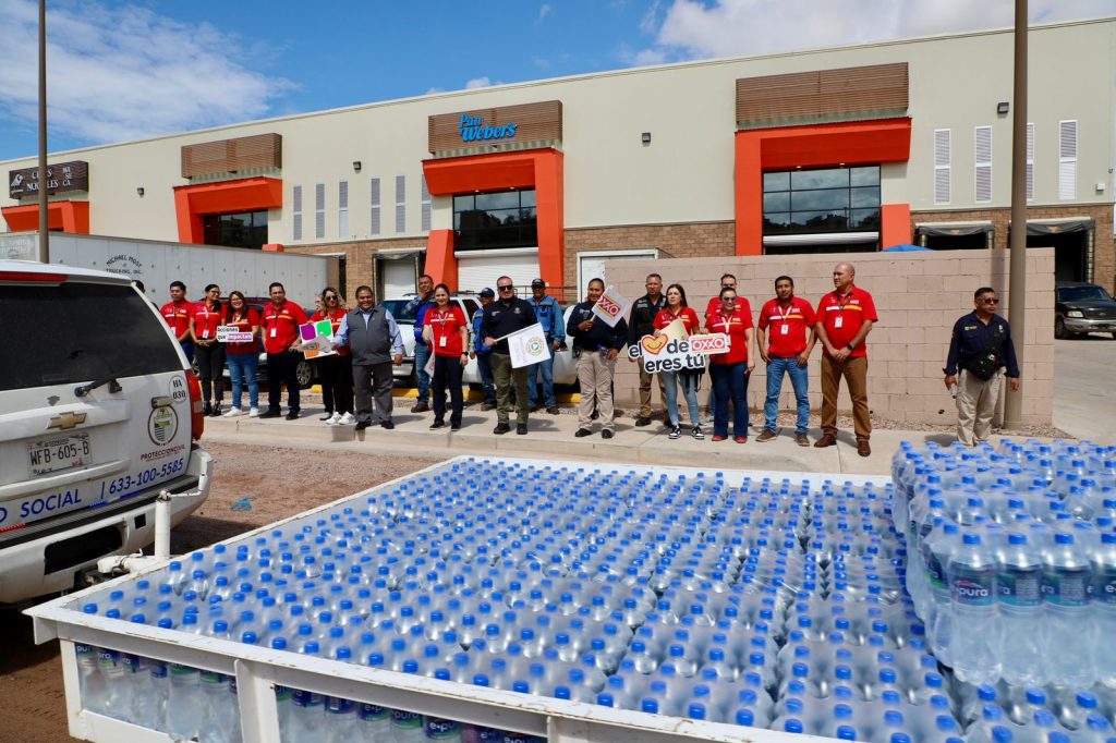Hermosillo, Sonora; 16 de julio de 2025.- Para proteger la salud de la población ante las altas temperaturas, el Gobierno de Sonora entregó 14 mil litros de agua embotellada en Nogales, como parte de una estrategia estatal coordinada por la Coordinación Estatal de Protección Civil (CEPC) y en colaboración con la cadena comercial Oxxo.