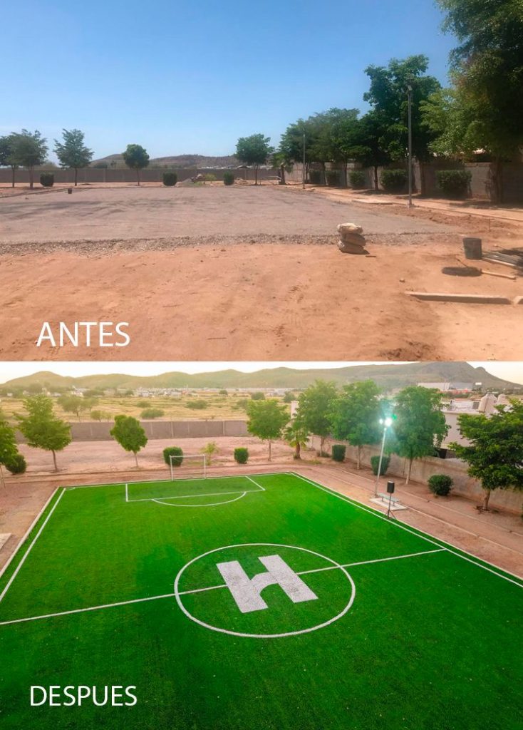 Inauguran Toño Astiazarán y familias de Villa Merlot nueva cancha de fútbol con pasto sintético
