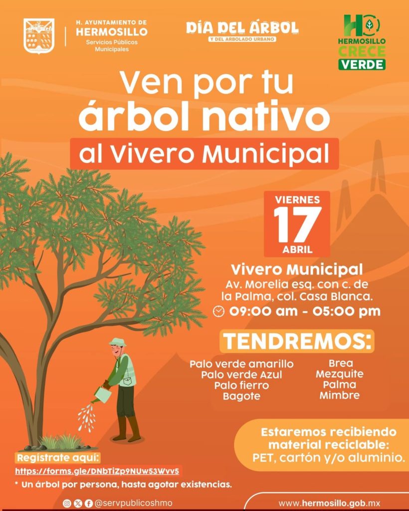 Hermosillo, Sonora; 15 de abril, 2026.- Adoptar un árbol nativo para contribuir en la reforestación en la ciudad invita el Vivero Municipal a las y los hermosillenses para que acudan este viernes 17 de abril a partir de las 9:00 hasta las 17:00 horas