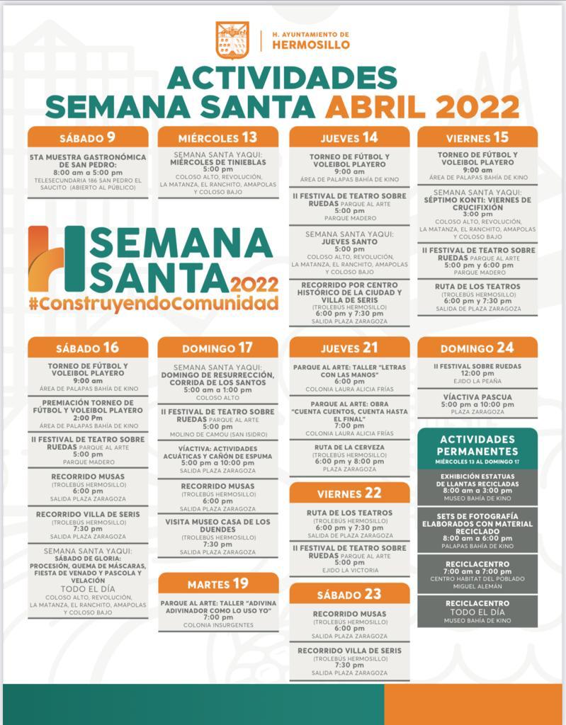 El Instituto Municipal de Cultura y Arte (IMCA) y la Dirección de Turismo de la Agencia Municipal de Desarrollo Económico invitan a residentes y visitantes a disfrutar las tradiciones milenarias de la Etnia Yaqui en las 7 ramadas que existen en la ciudad; los recorridos del Trolebús Turístico, los domingos de Viactiva y las presentaciones del “Segundo Festival de Teatro Sobre Ruedas”, consultables a través de las redes sociales de IMCA.