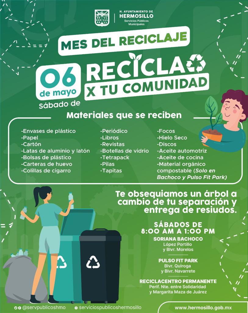 Hermosillo, Sonora; 5 de mayo, 2023.- Personal de Servicios Públicos Municipales celebrará el Mes del Reciclaje con varios eventos y acciones en busca de fomentar la cultura, el aprovechamiento y reutilización de materiales para cuidar el medio ambiente.