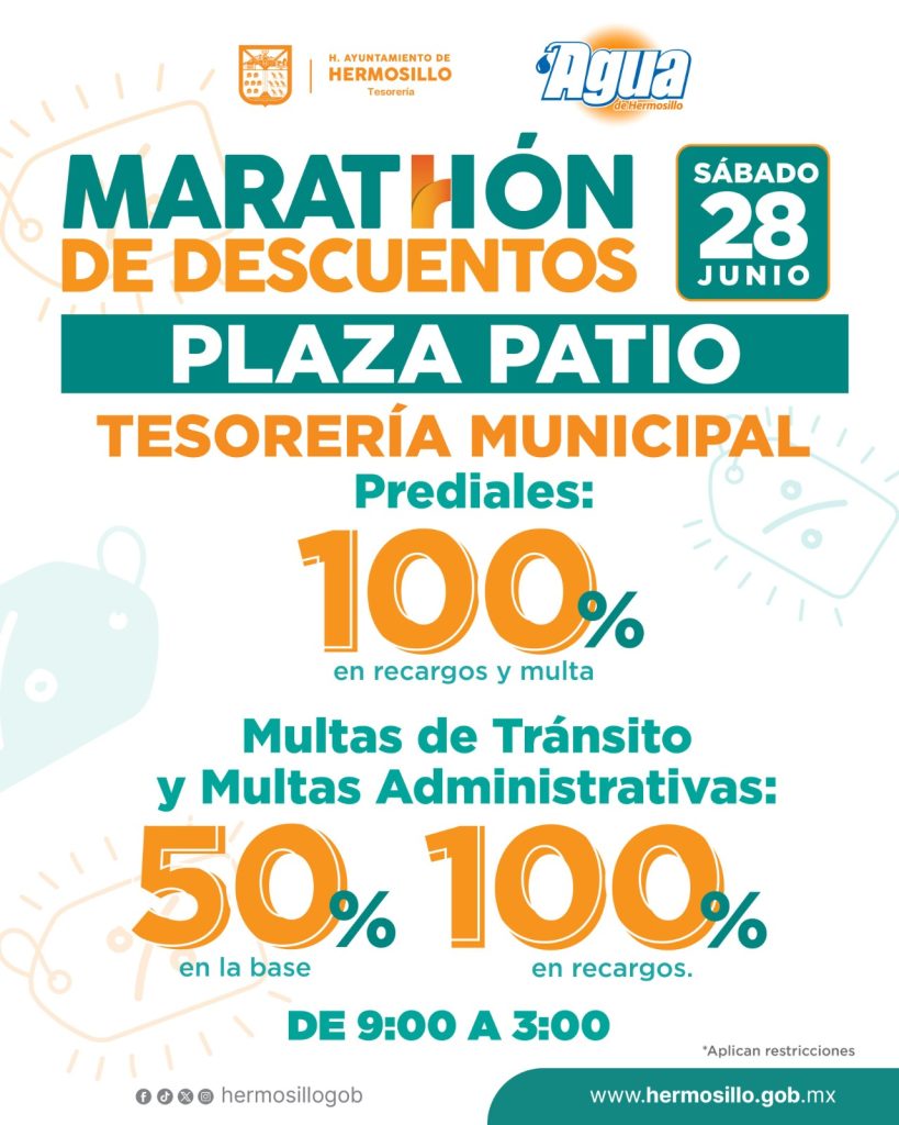 Hermosillo, Sonora; 26 de junio de 2025.– Este sábado 28 de junio, la Tesorería Municipal de Hermosillo invita a la ciudadanía a aprovechar el Maratón de Descuentos, una jornada especial para ponerse al día con pagos municipales sin recargos y con beneficios directos en el bolsillo.