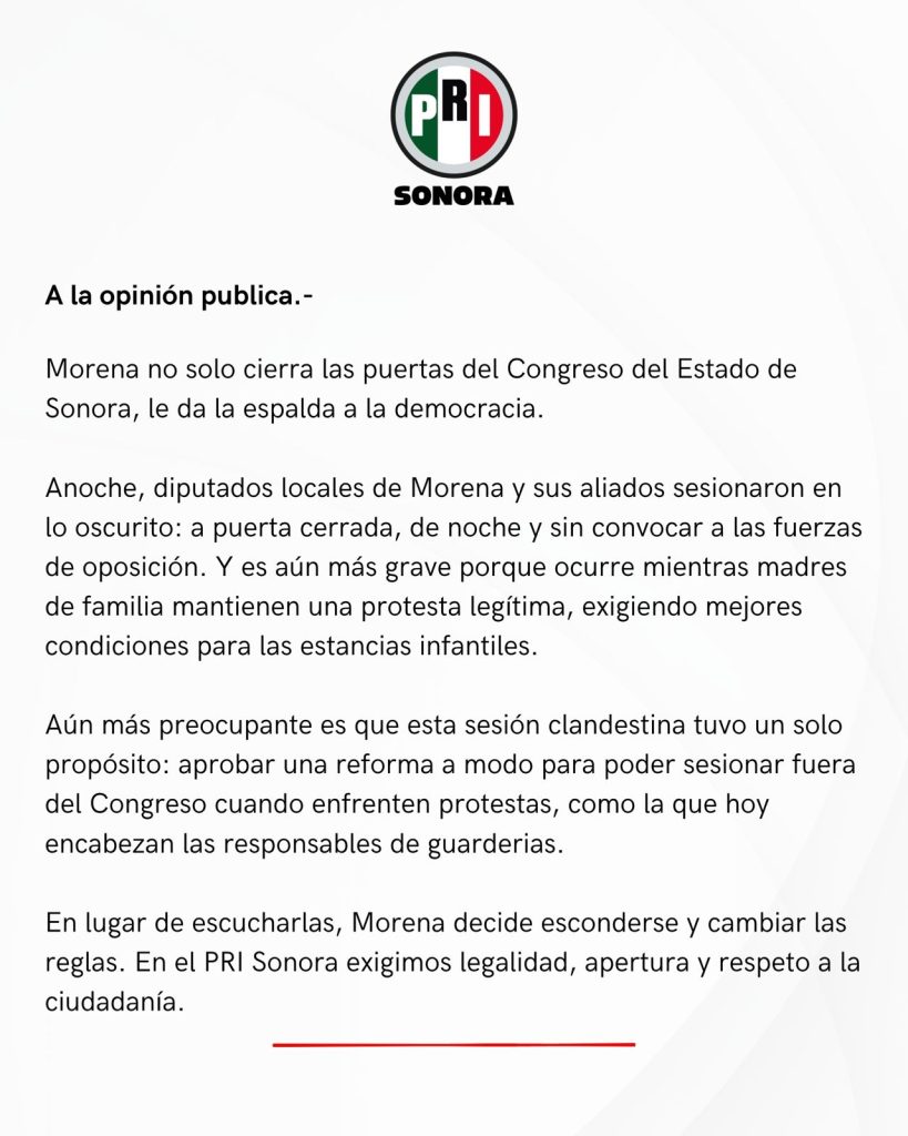 Finalmente, el PRI Sonora exigió legalidad, apertura y respeto a la ciudadanía, al tiempo que reiteró su llamado a que el Congreso del Estado actúe con transparencia y garantice el diálogo con todos los sectores sociales.