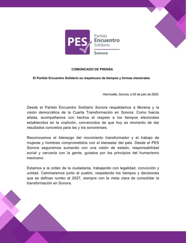Hermosillo, Sonora; 5 de julio de 2025.– Los partidos Morena Sonora y Partido Encuentro Solidario (PES) Sonora emitieron comunicados por separado donde coincidieron en su compromiso con el respeto a los tiempos y normas que marca la ley electoral, refrendando además su respaldo a los principios de la Cuarta Transformación en la entidad.