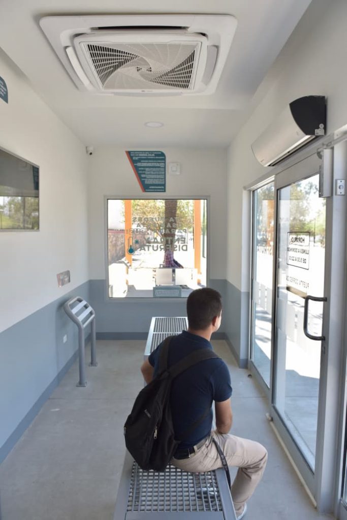 Hermosillo, Sonora; 5 de octubre de 2025.-Con beneficios como videovigilancia 24/7, refrigeración, internet Wi-Fi, visualización de rutas en tiempo real y módulos de recarga de teléfonos móviles, las paradas inteligentes instaladas por el Gobierno de Hermosillo ofrecen a los usuarios del transporte urbano mayor seguridad y comodidad.