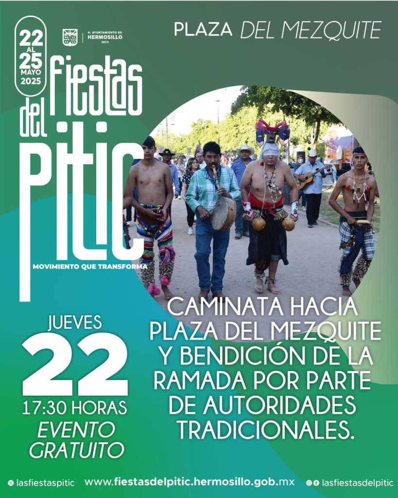 El jueves 22 de mayo a las 17:30 horas autoridades tradicionales yaquis protagonizarán una caminata hacia la Plaza del Mezquite, donde bendecirán la ramada que instalarán en el lugar y que será sede de cantos danzas y rituales tradicionales durante los 4 días de Fiestas del Pitic, informó.