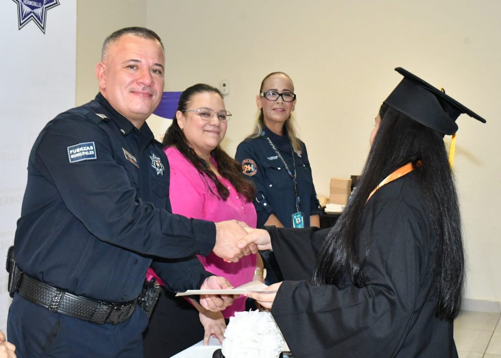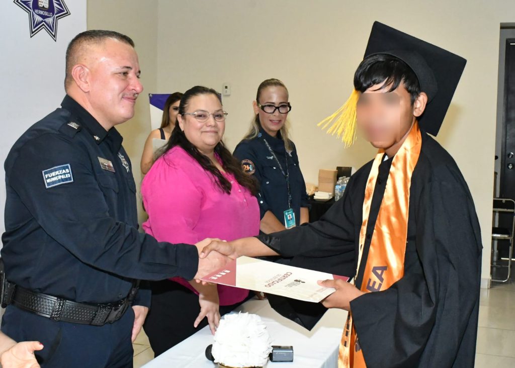 Hermosillo, Sonora; 16 de agosto de 2025.- Diez adolescentes concluyeron sus estudios de primaria y secundariagracias al programa de la Unidad Municipal de Prevención y Aplicación de Medidas a Menores Infractores (UMPAM), en coordinación con el Instituto Sonorense de Educación para los Adultos (ISEA), y recibieron sus certificados en una ceremonia encabezada por el comisario general de la Jefatura de Policía Preventiva y Tránsito Municipal, Jesús Alonso Durón Montaño.