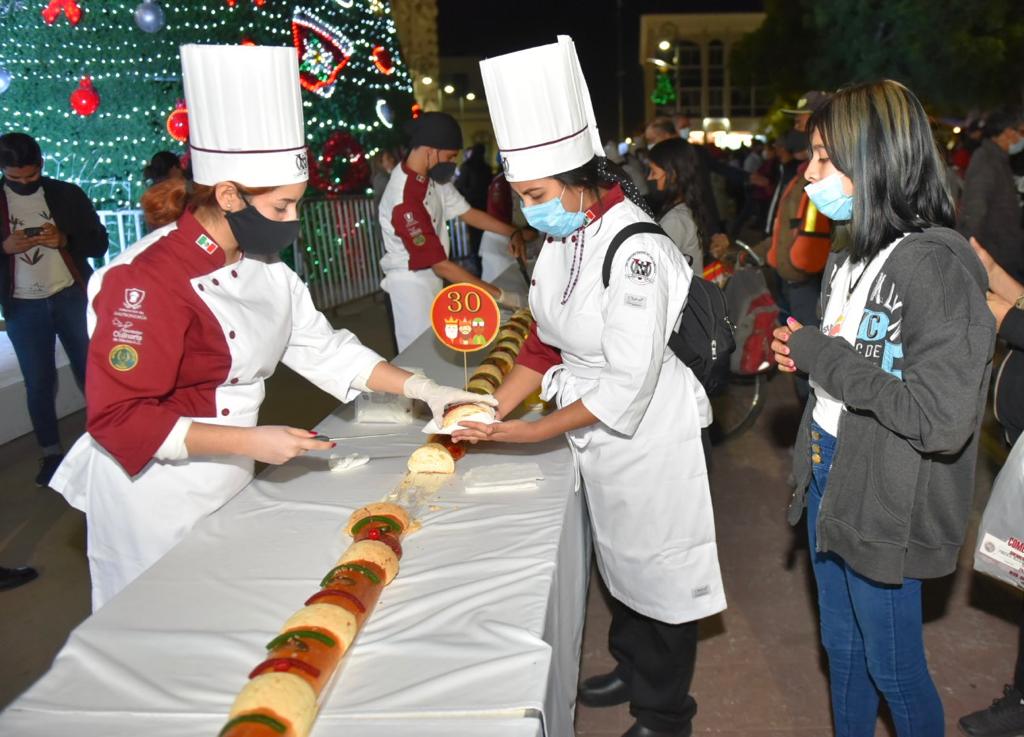 La elaboración de la tradicional rosca que fue supervisada por el Chef César Yedra, contó con la participación de 200 alumnos de la Universidad, quienes durante cuatro días prepararon y hornearon la Rosca de Reyes que por primera ocasión fue colocada en forma lineal, por cuestiones de seguridad sanitaria.